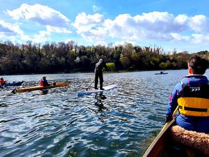 Bei schönem Frühllingswetter trafen sich am zweiten Ostertag 7 Mitglieder zu einer Osterrunde über den Baldeneysee. Mit SUP-Board, Canadier und Kajaks starteten wir gegen 11 Uhr in Richtung Staumauer. In der Sonne war es ein sehr angenehmes Paddeln; sogar Schildkröten saßen auf Baumstämmen am Ufer in der Sonne. Nach 6 km kehrte ein Teil der Gruppe um und legte bei Haus Scheppen eine ausgiebige Pause mit Kaffee und Kuchen ein. Die anderen genossen die Weite des Sees bis zur Staumauer und zurück.  >> weitere Bilder der Tour